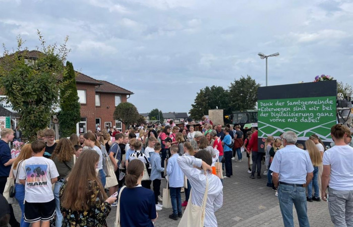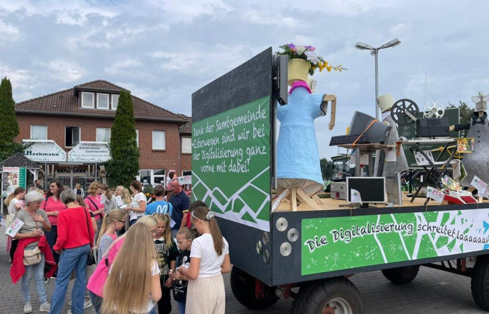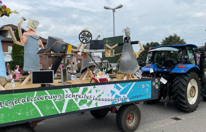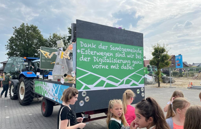 Beim festlichen Umzug durch den Ortskern waren wir ganz vorne mit dabei und starteten von Position 9. Unser Umzugswagen mit dem Thema „Schule heute- Die Digitalisierung schreitet laaaangsam voran“ wurde von rund 100 Schülerinnen und Schülern sowie dem gesamten Kollegium begleitet.