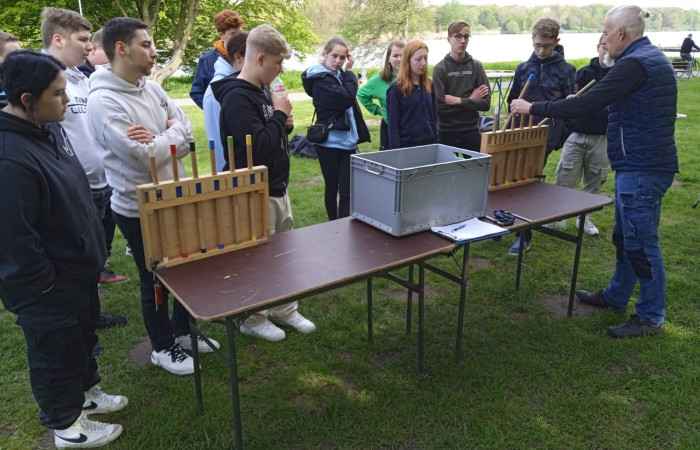 In kleinen Gruppen sollten die SuS verschiedene Aufgaben bewältigen, wie Bälle, die mit einem gespannten Gummi verschossen wurden, auffangen, Bälle auf eine kleine Plattform werfen, Stäbe der Größe nach Sortieren, mit einem Lasergewehr zielen, Biathlon.