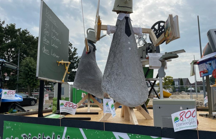 Beim festlichen Umzug  durch den Ortskern waren wir ganz vorne mit dabei und starteten von Position 9. Unser Umzugswagen mit dem Thema „Schule heute- Die Digitalisierung schreitet laaaangsam voran“ wurde von rund 100 Schülerinnen und Schülern sowie dem gesamten Kollegium begleitet.
