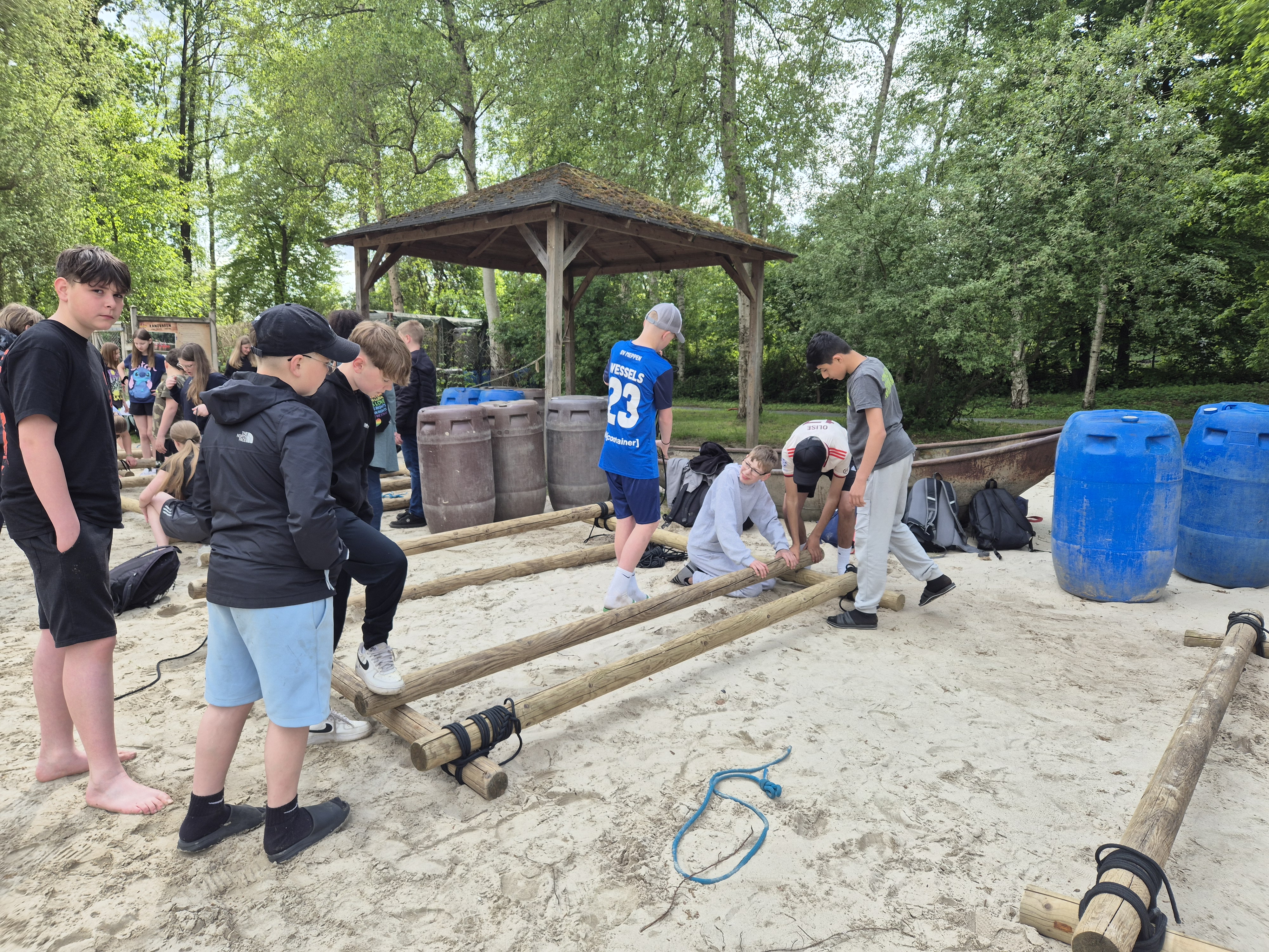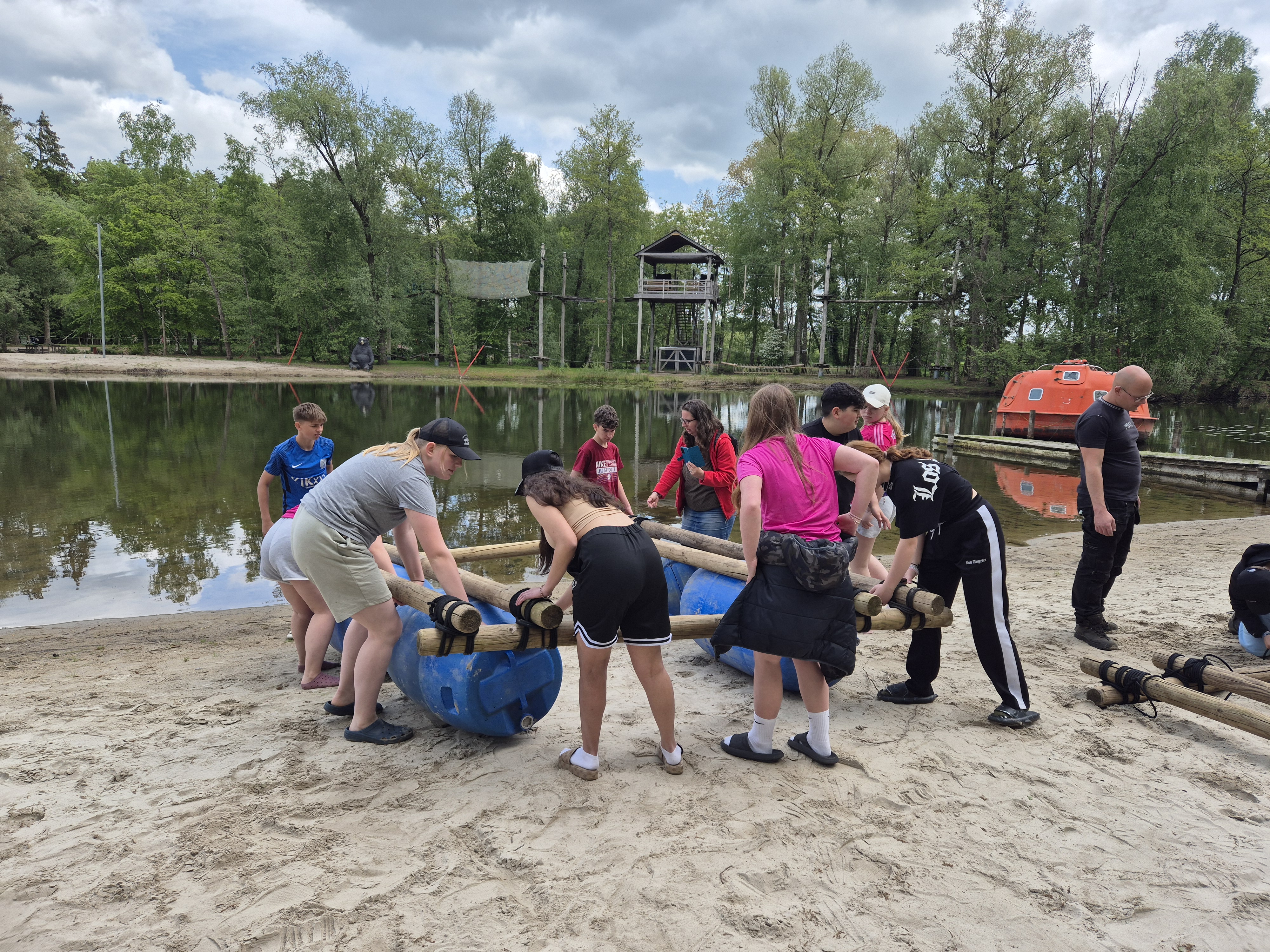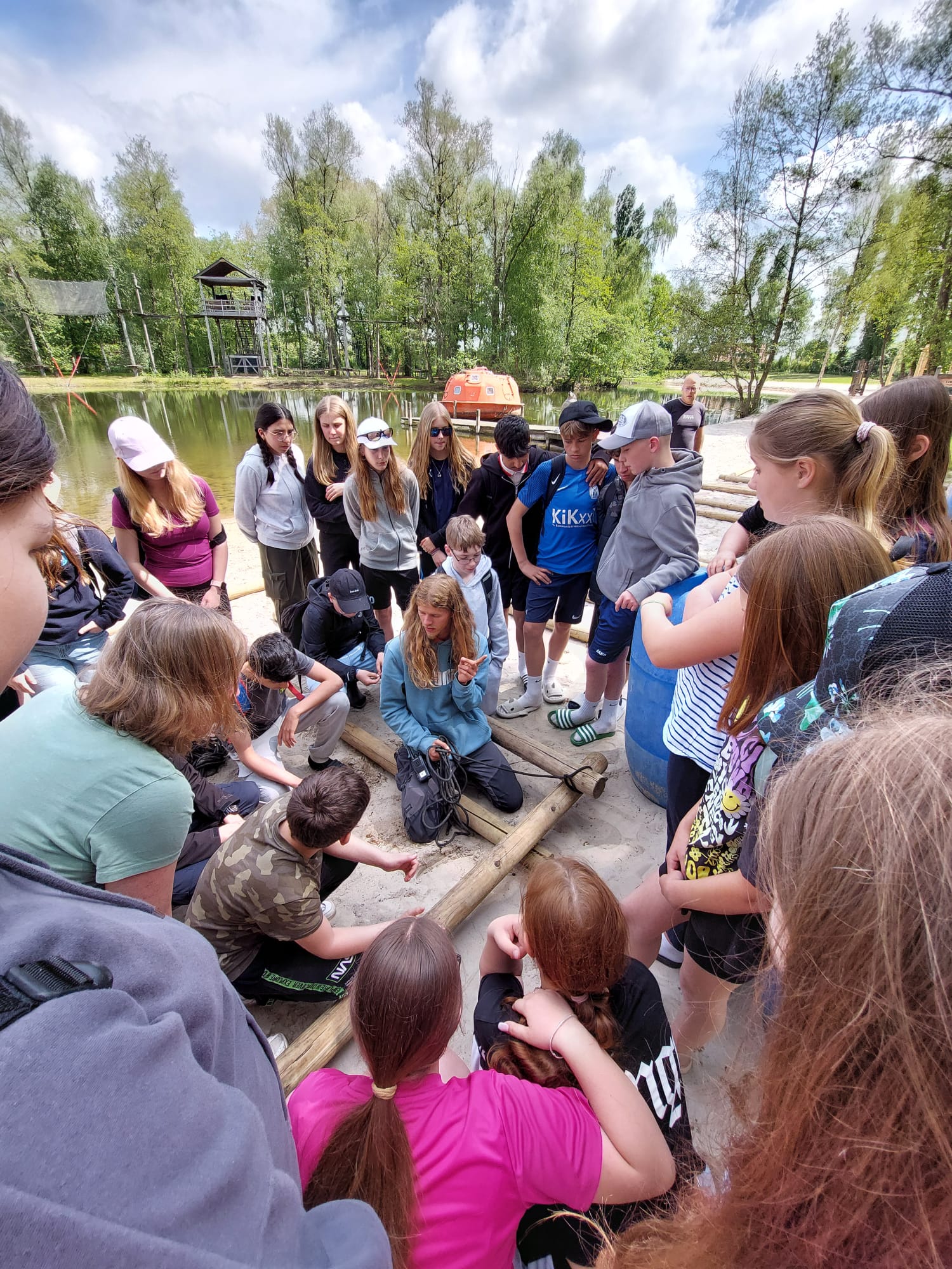Mittwoch: Zum Kennenlernen des Campgeländes gab es erst einmal eine Schnitzeljagd. Danach ging es zum Floßbau am See im ‚Woodland‘ – eine wahre Herausforderung!