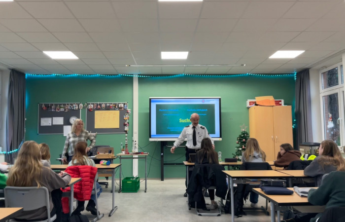 Nina Vinke und Gerhard Müßing von der Polizei Papenburg klärten im Rahmen des Projekts „Die Rauchmelder“ die Klassen H8 und R8 der Oberschule Esterwegen über die Droge Cannabis auf. Themen wie Abhängigkeit, Gründe für den Konsum und strafrechtliche Konsequenzen wurden dabei detailliert erklärt.