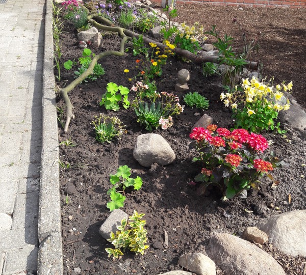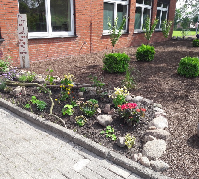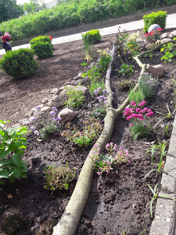 Bild 1Alles neu! Das Team „Beetgestaltung“ (SV-Projekt seit 2008) bekam den Auftrag, nach einer Veränderung der gesamten Fläche vor den Fenstern des Verwaltungsgebäudes, ein Beet von ca.1x4m anzulegen. Mit sachkundiger und finanzieller Unterstützung der Gärtnerei Hackmann in Werpeloh/Esterwegen haben sich am 15.Mai vier eifrige Jungs überlegt, tatkräftig und ideenreich an die Arbeit gemacht. Unter Aufsicht von Frau Fennen entstand ein buntes Beet, in dem sich immergrüne Pflanzen und jahreszeitlich blühende Pflanzen abwechseln. Auch an Blüten für Insekten wurde gedacht. Stein und Holz zieren die Zwischenflächen. Das Beet wird von dem aktuellen Team weiterhin gesäubert bzw. ergänzt. Lob und Dank an Luca Büter (H9b), Chris Eiting (H9b), Marlon Stricker (R9b) und Marlon Dirkes (H9b)!