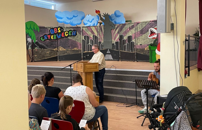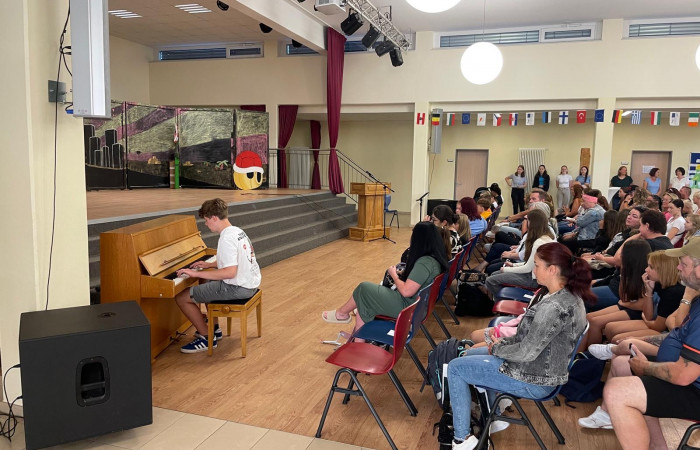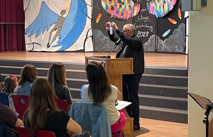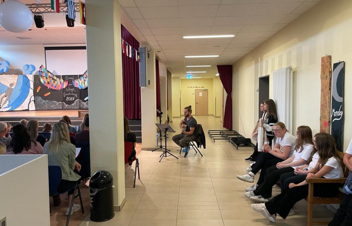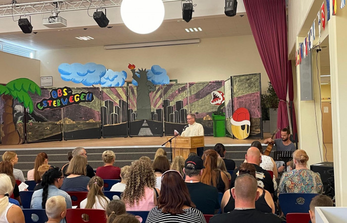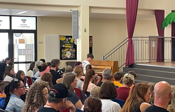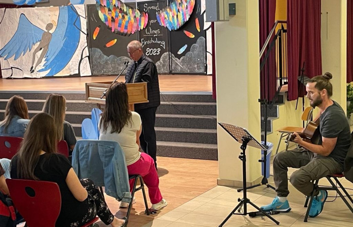Ein Wortgottesdienst mit Pfarrer Michael Schiller in der Aula eröffnete die Einschulungsfeier. Im Anschluss begrüßte Schulleiterin Frau Göhrs die „Neuen“ recht herzlich. Musikalisch umrahmt wurde das Programm mit unserem Schüler Karl Lindemann am Klavier und Herrn Kleine an der Gitarre.