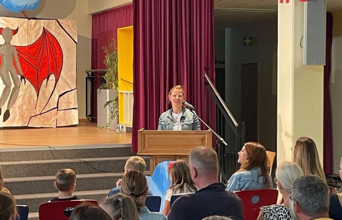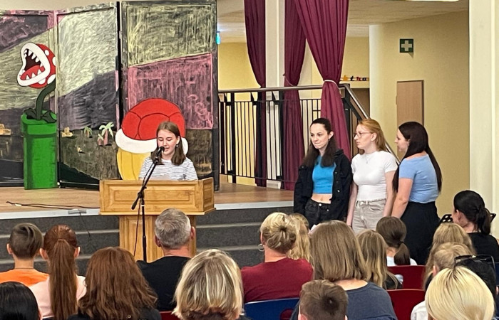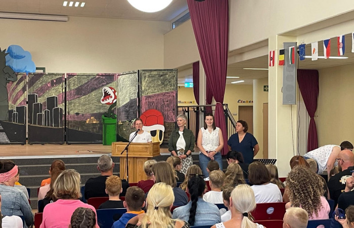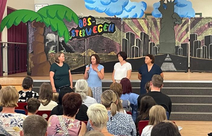 In diesem Rahmen stellten sich auch die aktiven Streitschlichter des Jahrgangs 10, Frau Schrand vom Ganztagsbüro, Frau Thomes als pädagogische Mitarbeiterin sowie unsere Sozialpädagoginnen Frau Kolbeck und Frau Abel den Schülerinnen und Schülern vor. Ebenso stellte sich Frau Markus als Beratungslehrerin mit stets offenem Ohr vor. Sie kündigte die Mädchen-AG an, die für diese Einschulungsfeier einen Tanz eingeübt hatten.