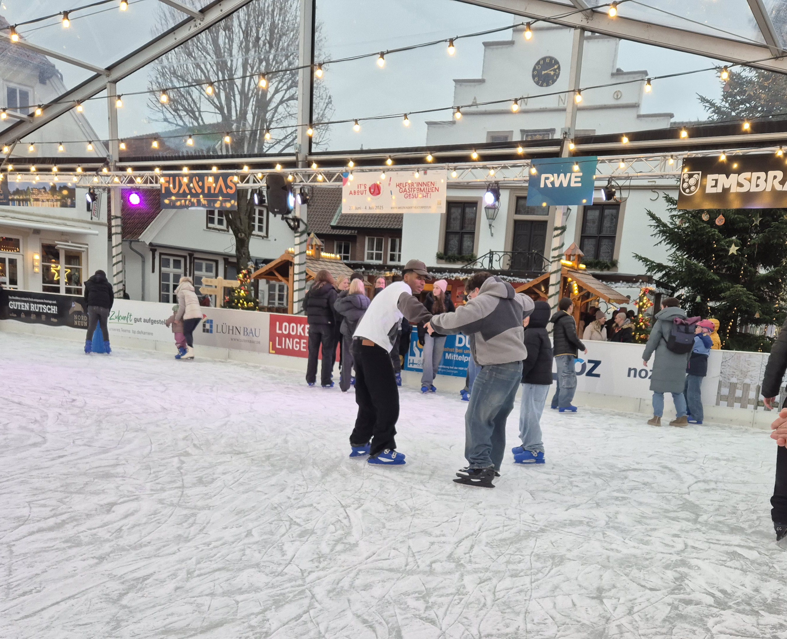 Anschließend fuhr der Bus uns nach Lingen zum Weihnachtmarkt. Mutig und begeistert wagten sich einige Jungs mit Schlittschuhen auf die Eisbahn.