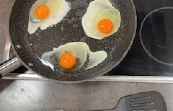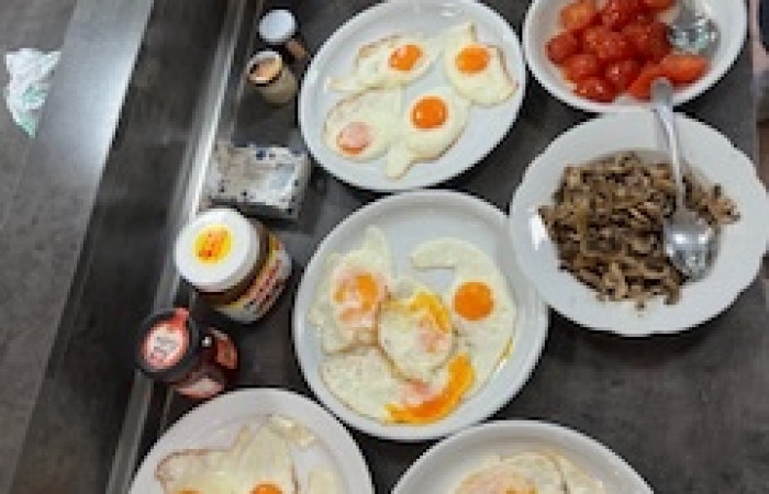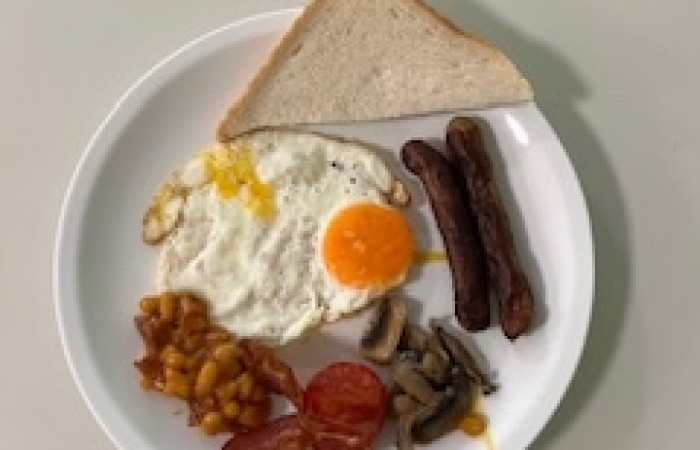 Nach umfassender Planung und der Zubereitung konnte endlich das deftige Frühstück aus Würstchen, Spiegeleiern, gegrillten Tomaten, Bohnen (Baked Beans), Bacon, Pilzen und Toast verzehrt werden.