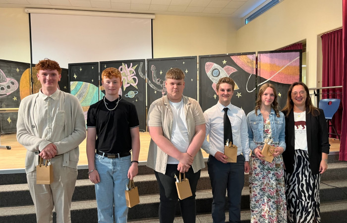 Insgesamt 5 Schülerinnen und Schüler erhielten aufgrund ihrer Leistungen als Klassenbeste/r ein Präsent vom Förderverein überreicht: Ben Böhmer (H9), Jannik Albers (H10), Malte Rolfes (R10a), Leo Lindemann (R10b) und Neele Katharina Hanneken (Gy10).
