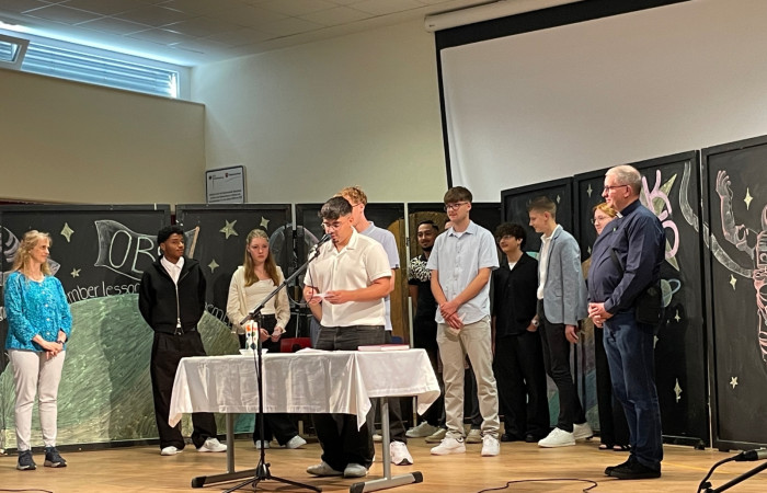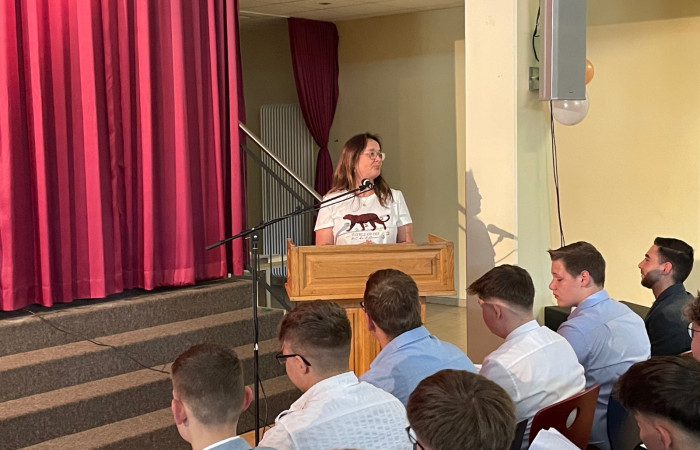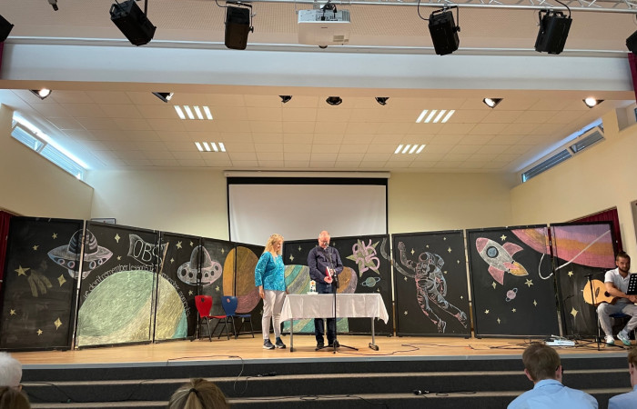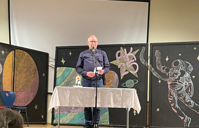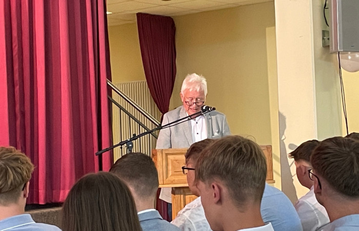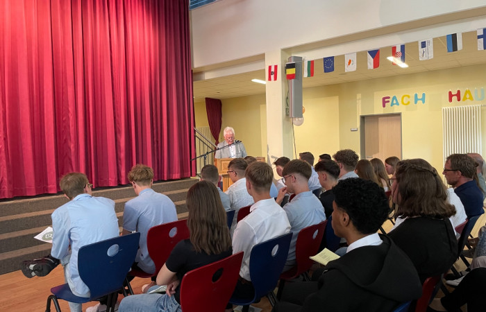 Pastor Schiller schilderte hierbei einen gemeinsamen Moment, den er mit den Abschlussschülern teilen durfte und allen in guter Erinnerung bleiben wird: Die Einweihung des Gedenksteins am Rathaus Esterwegen am 28.Januar 2025 zum Gedenken an das Schicksal der jüdischen Familie Jacobs aus Esterwegen am Holocaust-Gedenktag.